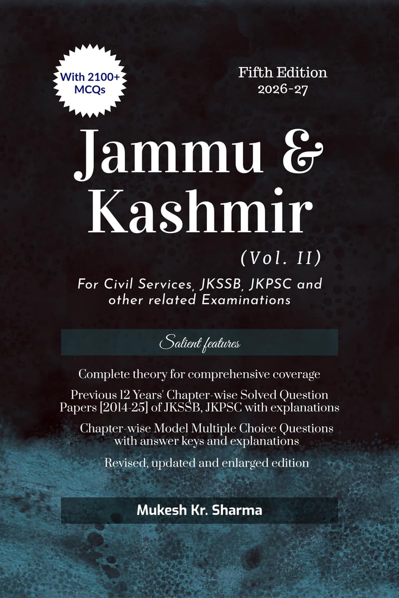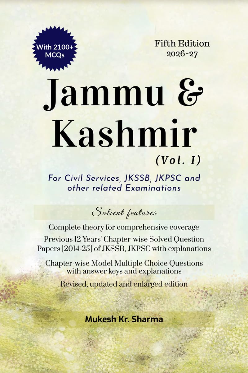 The book is a must-read for the aspirants appearing for the State Civil Services (JKPSC) Examinations as well as the Jammu and Kashmir Service Selection Board (JKSSB) Examinations. This book comes as a solution for the aspirants who continue to struggle for complete and examination centric content in a single source for a wide ranging subjects like History, Geography, Polity, Economy, Culture, and Panchayati Raj of UT of J&K. Chapter wise Multiple Choice Questions (MCQs) and Answers with explanations are given for the convenience of the aspirants. Previous Years’ Solved Question Papers of JKSSB, JKPSC with explanations are also provided in the book. Book is highly useful for upcoming JKSSB and JKPSC examinations. Contents1.1 The Erstwhile State of Jammu and Kashmir 1.2 History of Jammu & Kashmir (Including Ladakh)2.1 Jammu and Kashmir Reorganisation Act, 20193.1 Jammu & Kashmir Panchayati Raj Act, 19893.2 Jammu & Kashmir Panchayati Raj Rules, 19964.1 The People4.2 The Heritage 4.3 The Language & Literature 4.4 The Culture 5.1 Geography of Jammu and Kashmir: Introduction5.2 Jammu and Kashmir: Physiography5.3 Jammu and Kashmir: Mountain Ranges & Passes5.4 Jammu and Kashmir: Soils and Minerals5.5 Jammu and Kashmir: Climate5.6 Jammu and Kashmir: Agriculture & Irrigation5.7 Jammu and Kashmir: Drainage System6.1 Jammu and Kashmir: Flora6.2 Jammu and Kashmir: Fauna