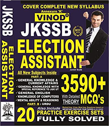 This EDITION with 3590+ MCQ’s (Including Topic Wise Theory) – Vinod JKSSB ELECTION ASSISTANT (Junior Scale) is a Post by Jammu and Kashmir Service Selection Board for students in Jammu and Kashmir. It Cover Complete Syllabus (Topic WISE description of Theory and MCQ’s are given for each topic asked in JKSSB syllabus). Thoroughly, it Pass a Mark of 3590+ MCQ’s in around 800 Pages. The Subjects inside the book are as follows; 1. GENERAL KNOWLEDGE AND CURRENT AFFAIRS 2. GENERAL KNOWLEDGE WITH SPECIAL REFERENCE TO J&K UT 3. GENERAL ENGLISH 4. KNOWLEDGE OF COMPUTERS 5. MENTAL ABILITY AND REASONING 6. URDU. With this, you get extra benefit of 20 PRACTICE EXERCISE SETS (Fully Solved) which makes this book a perfect recipe to crack JKSSB ELECTION ASSISTANT (Junior Scale) Exam